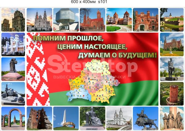 Cтенд с флагом Беларуси и историческими памятниками. Размер стенда 600х400 мм