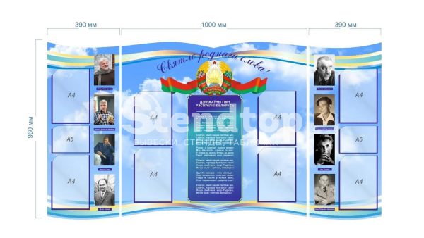 Cтенд в кабинет белорусского языка и литературы «Святло роднага слова» с изображением популярных белорусских писателей. Размер стенда 1780 х 960 мм. На ПВХ 3мм. Стенд 8 карманов А4 и 2 кармана А5. На стенде размещены фотографии белорусских писателей, с подписями к ним: Максiм Танк, Нiл Гiлевiч, Іван Пятровіч Шамякін, Уладзімір Сямёнавіч Караткевіч, Леанiд Дранько-Майсюк, Уладзімір Аляксеевіч Арлоў, Рыгор Барадулiн, Алег Лойка. На центральном стенде размещен: Герб, гимн и флаг Республики Беларусь.