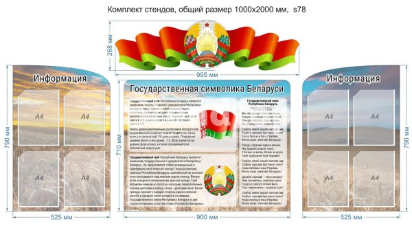 Комплект стендов с государственной символикой Беларуси, гербом, гимном и флагом, с карманами А4. Примерный общий размер — 2000х1000 мм, стенды изготовлены из пластика ПВХ 3 мм.