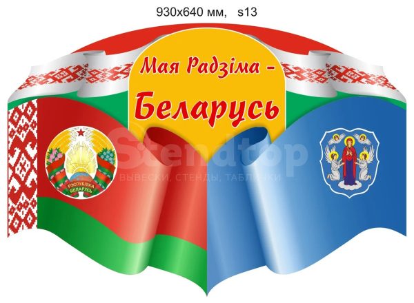 Стенд «Мая Радзiма — Беларусь» с гербом Республики Беларусь и гербом города Минска на фоне развивающегося флага. 930 х 640 мм.