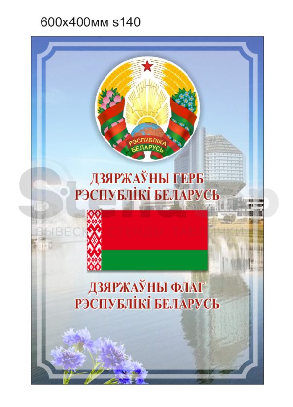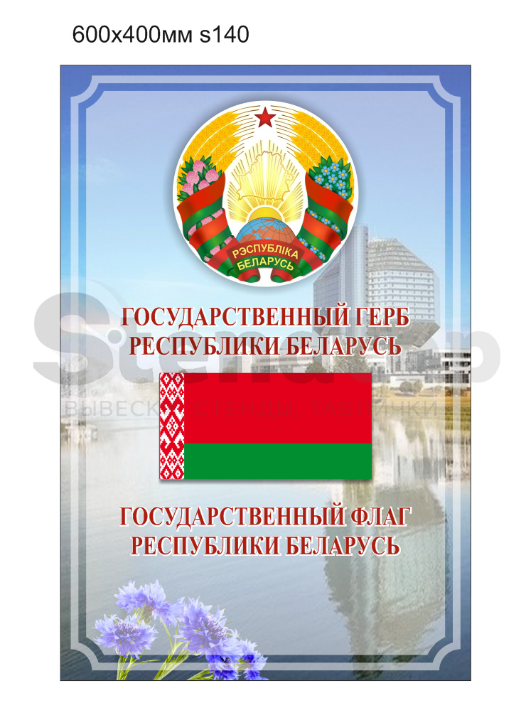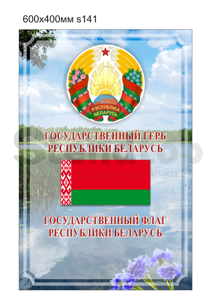 Стенд с символикой Республики Беларусь, с флагом и гербом 600х400мм. На русском и белорусском языках.